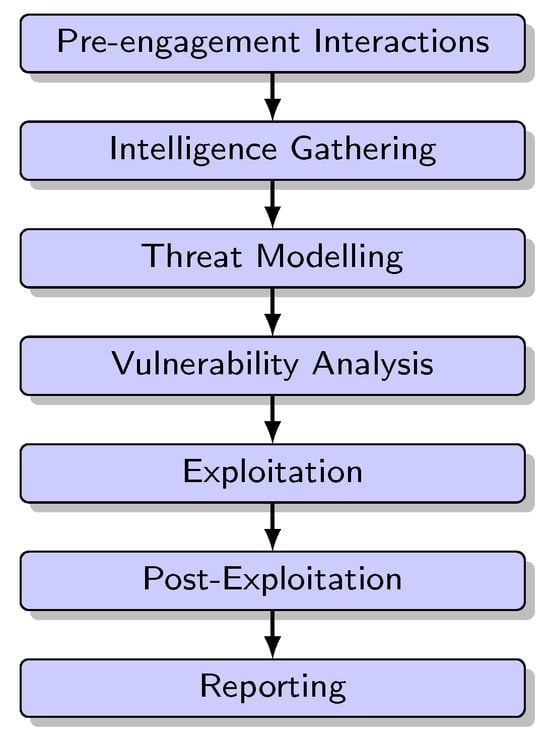 PTES [9] is a standardised methodology for planning, executing, and reporting security tests and it is widely used within the cybersecurity industry as one of the most significant standards for conducting penetration tests. PTES was proposed by a group of penetration testers and security professionals to provide guidance and best practices for conducting effective penetration tests within legal and ethical boundaries. It consists of seven phases (Figure 3):