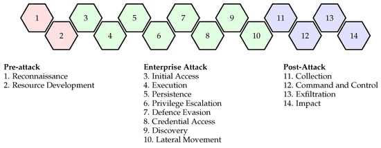 Mitre Adversarial Tactics, Techniques, and Common Knowledge [10] is a matrix that describes the behaviour of attackers throughout the life cycle of an operation. It covers Tactics, Techniques, and Procedures (TTP) used by threat actors to achieve their objectives. Mitre is a non-profit American company involved in numerous cybersecurity standards and frameworks, such as CVE (Common Vulnerabilities and Exposures) [28] to identify and classify disclosed security vulnerabilities. CWE (Common Weakness Enumeration) [29] is used as a common language for weakness identification, prevention and mitigation. See Section 4.2 for the details of this methodology.