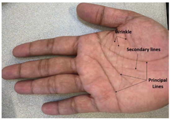 Advanced biometric recognition technology may be enhanced by ensuring that only authorized users can access a system [1]. This technology captures and validates user identities through physiological or behavioral biometrics such as face, iris, fingerprint, EEG, and voice [2,3]. Palmprint, a fast-growing and relatively new biometric, is the inner surface of the hand between the wrist and the fingers [1]. Palmprint refers to an impression of the palm on a surface containing rich intrinsic features, including the principal lines and wrinkles (Figure 1) [1] and abundant ridge and minutia-based features similar to a fingerprint [4,5]. These features result in high accuracy and reliable performance in personal verification and identification [6,7,8].