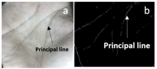 (a) Resized ROI image of palm and (b) detected principal lines.