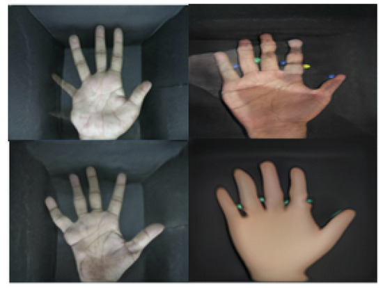 In the quality assessment of the generated images, various anomalies were considered to classify them as “good-quality” or “poor-quality”. Observers used specific annotations to identify and categorize poor-quality images. “Shadow over palm” referred to instances where shadows obscured parts of the palm, reducing image clarity. “Image imbalance” meant issues with uneven lighting or color distribution. “Overlap with two palms” described cases where parts of two palms overlapped. “Finger issue” referred to incomplete or distorted finger depictions, wrong number of fingers, etc. “No palm marker” indicated the absence of the principal line of the palm. Figure 10 shows four different types of anomalies.