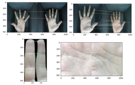 Pixel ratios of the images were calculated, such as distances and between specific points and , respectively, and the ratio of to was then computed. Images not accurately identifying the principal lines were excluded from the dataset using a ‘score value’ threshold. The threshold value for image quality is subjective to the algorithm and dataset being used. A ratio value between 0.2 and 0.8 to determine a well-matched image. For this research, an image pair was considered well matched for SIFT features if the ratio value exceeded 0.5. Figure 7 shows the palm’s scaled and resized images (ROI).