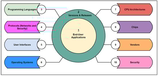 There are many permutations and combinations of this ten-dimensional space. Many releases and versions {2} apply to all other nine dimensions during evolution. Many end-user applications {1} meet user requirements in many areas. Depending on their domains, these end-user applications may be implemented in various computer programming languages {3}. A given end-user application may use a variety of networks and protocols {4} and user interfaces {5}. Most end-user applications run on top of some operating system (OS) {6}, and all computing systems run on some processor architecture such as Intel, AMD, and RISC {7}. Many processor chips exist {8} with multiple cores and other features. There are also many vendors {9} for software, hardware, and other components. Furthermore, there are a variety of cybersecurity methodologies, computer architectures, and implementations {10}. There is heterogeneity and redundancy in the above dimensions and rapid obsolescence. The ever-changing hardware, software, and related products contribute to increased complexity and related cybersecurity issues [] in computer and information systems, resulting in a waste of resources and human skills, recurring costs, dumping of hardware, and reinventions in many dimensions. The attributes discussed here are mainly due to obsoleting products before their life span []. Surprisingly, many other aspects of obsolescence, including planned obsolescence [,,], focus on sustained revenues and profits for the industry. Microprocessor and OS obsolescence are the main contributors to fast changes in computing and information systems.