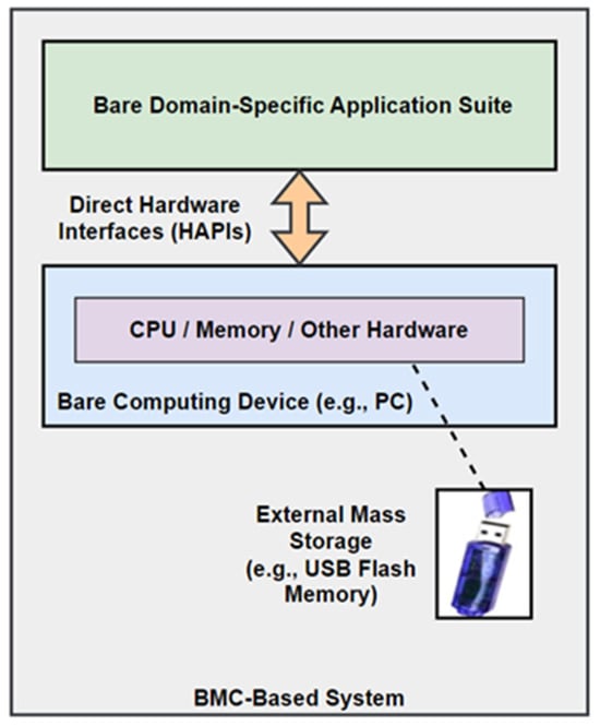 The BMC paradigm was originally motivated by the rapid obsolescence [] and continuously emerging security vulnerabilities in computer and information systems. Obsolescence impacts computers and information systems, causing hardware and software to be replaced before their useful life span. The topic of obsolescence is not within the scope of this paper. The BMC approach resembles computing when it started in the 1960s using bare hardware operated with switches and buttons. In current technology, hardware is cheap, provides many functionalities, and allows more logic to be placed on a single chip. It also allows computing devices to be bare, as a processor can provide needed hardware interfaces to application programmers.