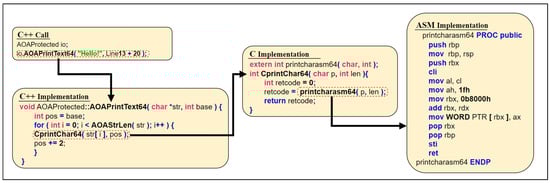In a BMC system, as shown in Figure 4, applications directly communicate with the hardware without any middleware. For example, suppose we want to print the text “Hello” on the screen. Figure 5 illustrates how a programmer can directly control writing on the screen without using an OS. This simple example shows how a programmer can directly access the hardware through C++ -> C -> assembly as a single thread of execution without interruption. It also shows how a programmer views the underlying hardware in the BMC paradigm. It is possible to automate this process to make it user-friendly for developers. In this example, the assembly call writes string data to the video memory location at 0x000b8000. A BMC programmer controls all the code shown here. There are no other dependencies in the BMC code. This philosophy is carried throughout the development process of any BMC application. Using this approach, we can write all direct hardware interfaces needed for information systems applications and development. Eventually, these direct hardware interfaces can be built on the processor chip. If the output must go to graphics memory, the same logic is used with the help of a bare graphics driver. A BMC system is not the same as a bare metal system or embedded Linux [], as BMC is a general-purpose computing paradigm. BMC servers are not the same as bare-metal servers or virtual servers in the cloud [], which require some OS to provide services.