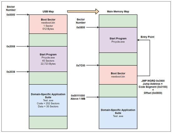 Each application suite can define its own memory map, as shown in Figure 6. This memory map shows how content in an application suite USB is copied into main memory. The boot code from sector 0 is copied into memory location address 0×7c00 (for IBM Compatible PCs). The start program from the USB is copied at memory location 0×600 and includes two header sectors. The start program is loaded in the real memory area. After the boot program runs, it jumps to 0×3900 in real memory to run the start program. When the start program runs, it copies the domain-specific application suite executable from the USB into the memory location starting at 0×00111000, which is above 1 MB and is in protected memory. When the start program is completed, it starts executing at 0×00111000 (which is a main () entry point). All these numbers are extracted by using Microsoft tools to identify entry points and other components in the executable. Notice that there is no need for virtual memory in BMC systems, as there is no OS and only a few applications are bundled and run at a time. Each domain-specific application suite has its own characteristics and can be loaded in custom locations in memory accordingly. This process can also be automated in BMC systems. The above memory map can be customized for domain-specific application suites, which shows simplicity and flexibility in building BMC applications.