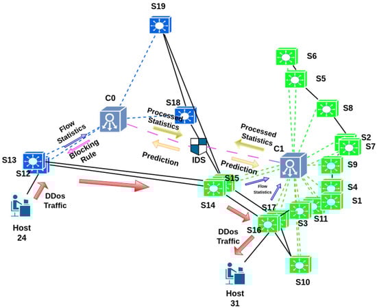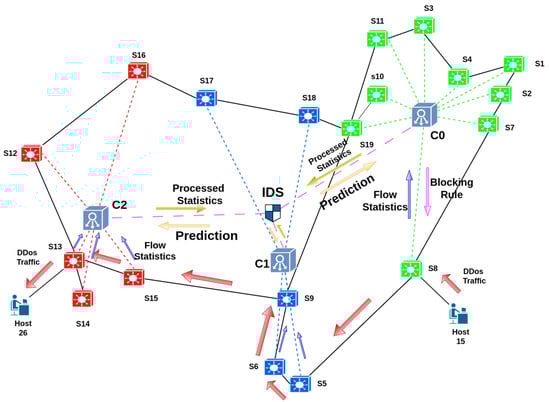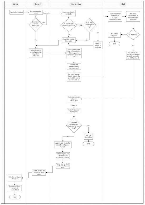 The workflow diagram of the designed system is shown in Figure 2. This diagram summarizes the entire workflow of network traffic (both benign and attack), providing a visual representation of how the multi-controller setup is organized to detect and mitigate DDoS attacks efficiently. The communication scheme between different components of the SDN environment, the host–switch, switch–controller, and controller–IDS is shown. A switch forwards the packets from a host to the respective interface using the flow table. Switches also advertise the flow information to their associated controller every 10 s. A controller does the job of managing the flow table of the switch and also performs feature extraction and pre-processing of the flow information, which will be sent further to the central IDS. IDS performs the task of classification of the traffic, benign/attack, and in case of an attack traffic, it broadcasts the attacker source information to each of the controllers. The controller with an attacker in its domain upon receiving this attacker information will activate the mitigation module and will request the installation of a flow in the respective switch to block the port of the attacker. The switch, upon receiving this request, will install this flow, and as a result, the attacker will be blocked for a predefined duration of 10 min. For normal traffic, no specific action is performed, and the traffic follows a normal natural route. A more detailed explanation on the detection and mitigation mechanism is provided in Section 3.9.