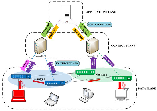 Software-defined networking (SDN) is a newer network paradigm consisting of three planes, viz. data, control, and application planes, where data and control planes are independent of one another [1]. In traditional network architecture, the control plane and data plane are interconnected [2,3]. SDN is a cutting-edge paradigm that solves issues with traditional Internet architectures. It provides flexibility in management by allowing networking to be programmed from a logically centralized control point [4]. The controller uses a northbound Application Programming Interface (API) to communicate with the application layer and a southbound API to communicate with the data plane. An OpenFlow protocol is used for controller–switch communication. Because the control plane and the data plane are separated, SDN offers numerous benefits over traditional networks, including programmability, flexibility, and scalability. But this has also given rise to other SDN-specific security problems [5].