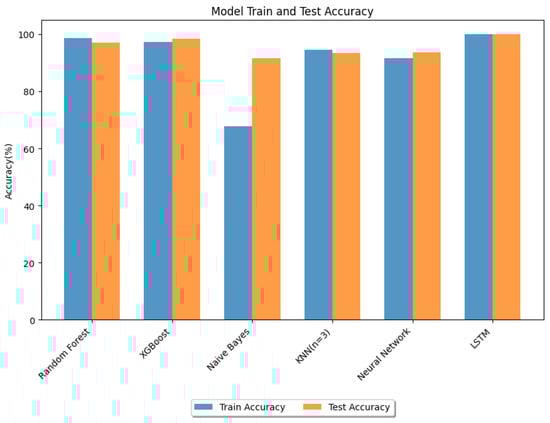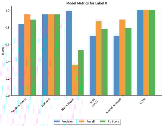 From Table 2, it can be observed that random forest, XGBoost and LSTM offered greater than 95% test accuracy; this solves the detection part. However, to perform swift mitigation, a quicker response is equally important, and this faster response time has set XGBoost apart from others. The training accuracy of Naive Bayes was notably lower, as indicated in Figure 12, and a particularly low recall rate. Consequently, we decided not to continue with Naive Bayes. On the other hand, KNN exhibited a relatively longer test duration (Figure 13) and a low recal rate. A lower recall rate for both Naive Bayes and KNN is shown in (Figure 14) for benign traffic.