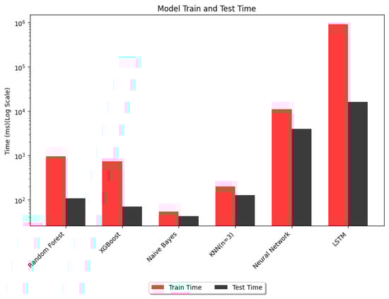 The computation time and accuracy are key factors that define the performance of an IDS. Therefore, the performance of ML models was assessed based on test time, which refers to the time taken to process the entire test set, as well as their accuracy, including precision, recall, and F1-score.