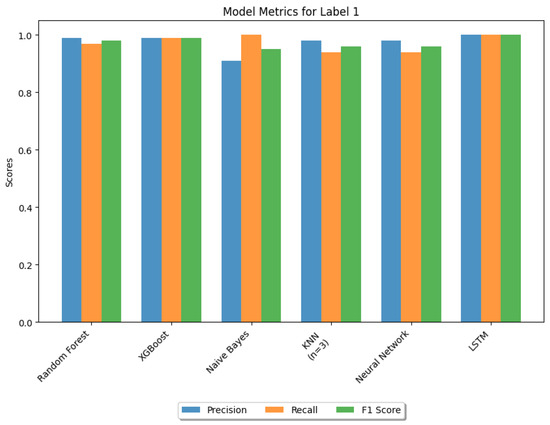 The LSTM model was developed using a sequential architecture. Its first layer included a bidirectional LSTM, which processed input sequences in both forward and backward directions, capturing past and future contexts. This LSTM layer consisted of 64 units, used the hyperbolic tangent (tanh) activation function, and applied L1 regularization. A second, fully connected dense layer with 128 units employed the ReLU activation function and L2 regularization. The output layer featured a single neuron with Sigmoid activation for binary classification. As LSTM works on time series data, individual instances from our dataset need further manipulation to be considered time series. Therefore, a sliding window approach [37] was adopted for both the training and testing phases. A window size of 25 (an arbitrary assumption) was used with each training instance being all instances within this window. This method enabled the training dataset to be processed as a time series. The same procedure was applied to the test set. If implemented in an IDS, an LSTM processes frames using a window of 25; if a frame contains fewer than 25 instances, the LSTM generates results based on the available instances. The random forest model was configured with 10 estimators and used entropy as a loss metric. For the KNNs algorithm, the hyperparameter was set to 3 neighbors.