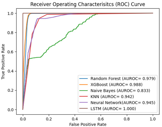 The receiver operating characteristic (ROC) curve depicted in Figure 16 reveals findings that support Table 2. Better classifying algorithms have a strong inclination toward the top left corner. Complex deep learning models such as LSTM outperformed other models. But despite the best performance, for our case, it took a significantly high prediction time of 16 seconds to classify the same data in comparison to XGBoost, which took 70 ms. The high testing time is proportional to the decision time of the IDS. If LSTM had been implemented, it would have resulted in a higher response time due to the time-series nature and sliding window methodology, which adds additional computational overhead. Therefore, it is not suitable for near real-time detection and mitigation. Consequently, LSTM was not implemented in our model.