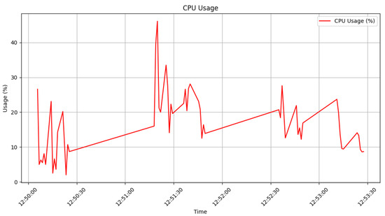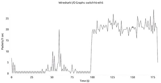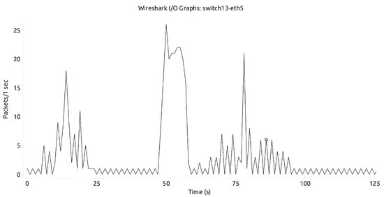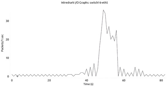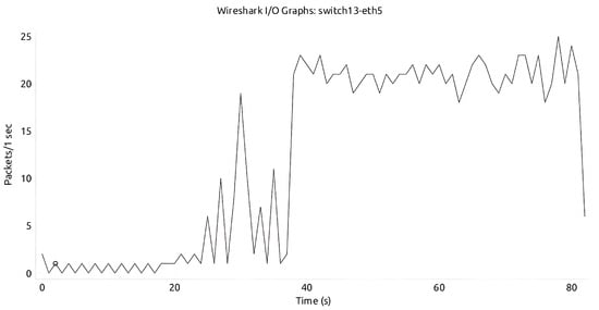With the mitigation module in action, there is a significant reduction in the number of packets, as shown in Figure 19 and Figure 20. There were fewer counts from the DDoS attack being sent to the victim, hence preventing the attack. Also, from Figure 21, it can be observed that CPU utilization increases significantly at the instance of DDoS attack (from time 12:51:00–12:51:30), and after the application of the mitigation module, it returns back to the normal state.