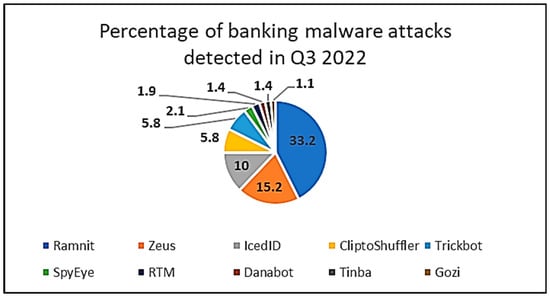 New malware variants are always being discovered and are becoming more sophisticated in the way that they attack systems [9], and they will continue to increase [10]. Banking malware follows the same trajectory, and, in this category, Zeus and its variants are still the most prevalent and widespread of all the banking malware variants discovered. For example, Figure 1 shows that Zeus and Ramnit were amongst the top ten banking malware variants discovered in Q3 of 2022 [11]. Figure 2 depicts the number of banking malware attacks that were detected during the same time, and an upward trend is clearly visible [11].