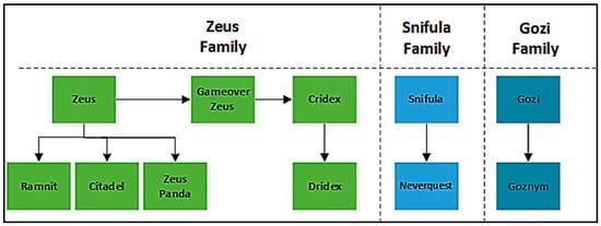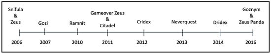 This section examines and discusses the relationships between the three banking malware variants that were discussed above and establishes a timescale of when they emerged. Figure 3 shows that Zeus was discovered in 2006 [29], Ramnit was discovered in 2010, and Zeus Panda was discovered in 2016 [30], and research indicates that they all share similar code and perform similar actions. Based on this research [30,31,32,33,34,35,36], this paper proposes that all banking malware variants belong to a specific family of banking malware, and this proposed family tree can be seen in Figure 4. A historical timeline of a selection of banking malware variants can be seen in Figure 3, which suggests that all banking malware variants can be traced back to one of the parent banking malware variants, Zeus, Snifula, and Gozi, as shown in Figure 4.