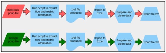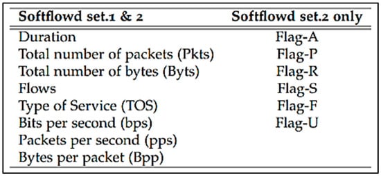 After the data were collected, a program called Softflowd was used to extract the features that were used during the experimental analysis. Two feature sets were used, and these are depicted in Figure 5.