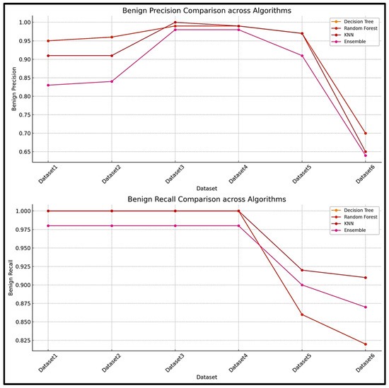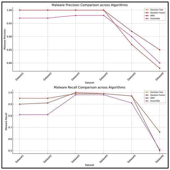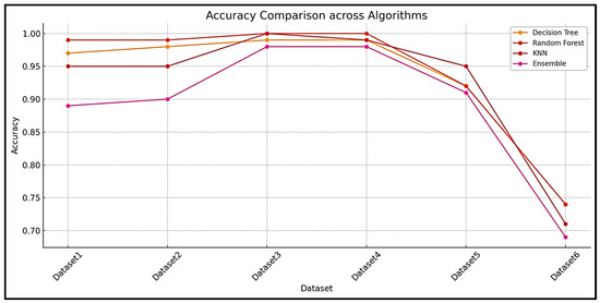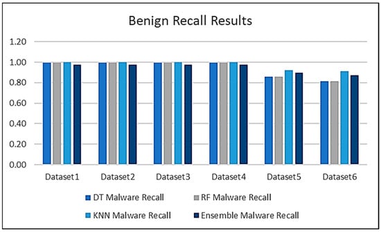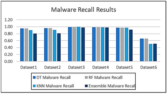 Three ML algorithms and an ensemble approach are all examined, analyzed, and compared in this paper, and these include the decision tree (DT), random forest (RF), and K-Nearest Neighbors (KNN) ML algorithms. The ensemble approach combines all three of the above algorithms, and the rationale for selecting these three algorithms is that, in [17], many common machine learning algorithms were tested, and it was determined that the random forest, decision tree, and KNN machine learning algorithms performed the best when used for detecting malware C&C communication traffic. Ref. [17] also demonstrated that these ML algorithms performed better than or similar to several deep learning approaches. Ref. [18] also concluded in their research that, out of over 179 ML algorithms tested, the KNN, SVM, random forest, and decision tree algorithms performed the best.
