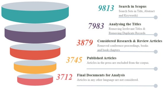 Figure 1 demonstrates the document search framework using a funnel approach during this research, gradually reducing an initial collection of 9813 documents to the final 3712 counts. The main objective is to collect a complete group of high-quality articles that will later be analysed. Each phase includes a description that explores technological structures, system component assembly, and motivational design factors.