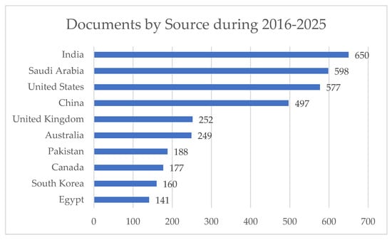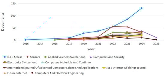 Finally, this section highlights the growth of research in cybersecurity and machine learning (ML)/deep learning (DL) from 2016 to 2025. Three thousand seven hundred twelve publications were recorded over this period, evidencing the growing importance of this area. The data are from Scopus and cover 114 countries, 2865 authors, 160 organisations, and 159 sources. Figure 5 depicts the documents per year by source.