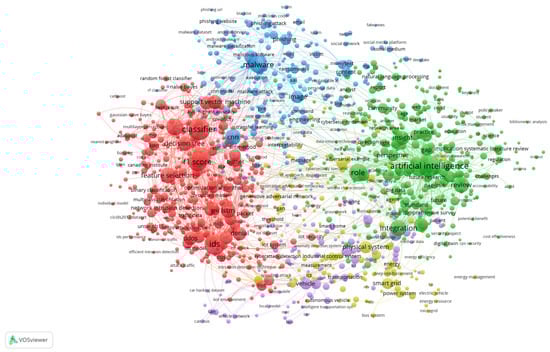 The most common word, by far, was the keyword artificial intelligence (AI), which surfaced 476 times, with a maximum link strength of 5853. It is not that surprising, though. AI is fundamental in many cybersecurity applications, mainly anomaly detection, behaviour analysis, and automation []. Due to the high frequency and strong link strength, research on this subject relies heavily on AI, as multiple studies strongly agree with using AI-based models and algorithms.