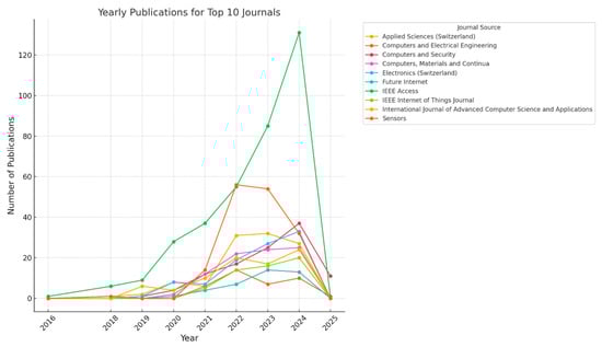 A bibliographic study of cybersecurity studies reveals an increasing trend of research on ML/DL applications within the field from 2016 up to 2025, as shown in Figure 2 and Figure 5. Yearly growth data demonstrate how theoretical work on new architecture and algorithm structures, practical IoT security, and other applications expand continuously in the field. The ongoing growth demonstrates a widespread belief that ML/DL will continue strengthening cybersecurity infrastructure, which protects conventional networks, emerging smart cities, healthcare systems, and autonomous vehicles.