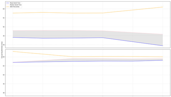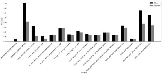 Gosh–Kate protocol’s implementation by Schanck et al. [11] showed, on average, a smaller computation time (900 μs) but a larger number of bytes (1344). On the other hand, their hybrid design heavily relies on the client role (661 μs for client init and 74%), which could increase latency if the client’s device has limited resources. However, their hybrid design implementation reduces the number of computational steps and amount of data exchanged. The evaluation is limited to NTRUEncrypt only; comparing it with other quantum-robust schemes would shed light on the efficiency of the overall hybrid implementation. They highlight a major obstacle: the size of the circuit-extension handshake “CREATE” cells is limited to 505 bytes (in NTOR), while ntruees443ep1 requires 693 bytes [11]. The work resulted in two distinct specification proposals: one aiming to widen the cell size [5] #249, and the other to enable the hybridisation of the ntor protocol and a KEM. The first one has been superseded by proposal #340, introducing the sub-protocol “RelayCell”, which focuses on cell packing and fragmentation. The second, Ref. [5] #263, was made obsolete by proposal #269; created by the authors of the papers and Tor’s developers, it takes the incorporation of different post-quantum KEMs further and emphasises compatibility with Tor’s handshake.