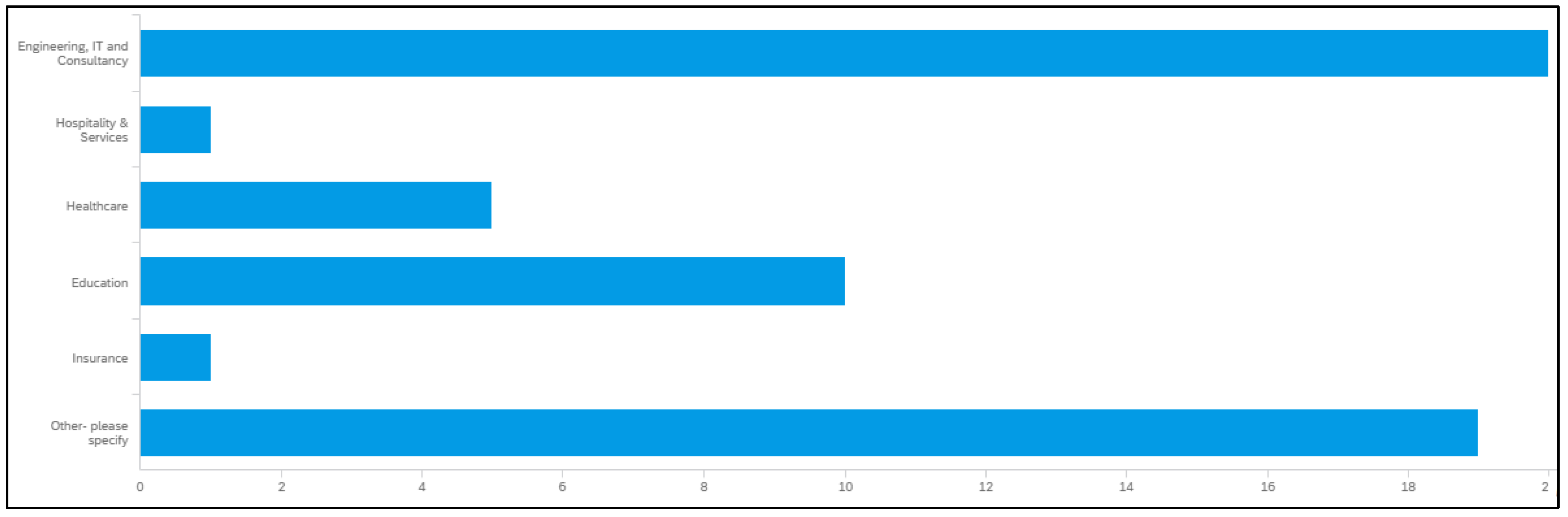It was observed that “Other—please specify” was the most common category, with 10 entries, as shown in Figure 4. This suggests that many respondents’ industries did not fit into the predefined initial categories declared. “Engineering, IT, and Consultancy” was the second most common category, with 6 entries. “Healthcare” had 3 entries. “Hospitality and Service” and “Insurance” each had 1 entry. This distribution showed a diverse range of industries in the dataset, with a notable concentration in the “Other” category and the “Engineering, IT, and Consultancy” sector. The high number of “Other” responses indicated that the predefined categories did not fully capture the range of industries represented in the survey.