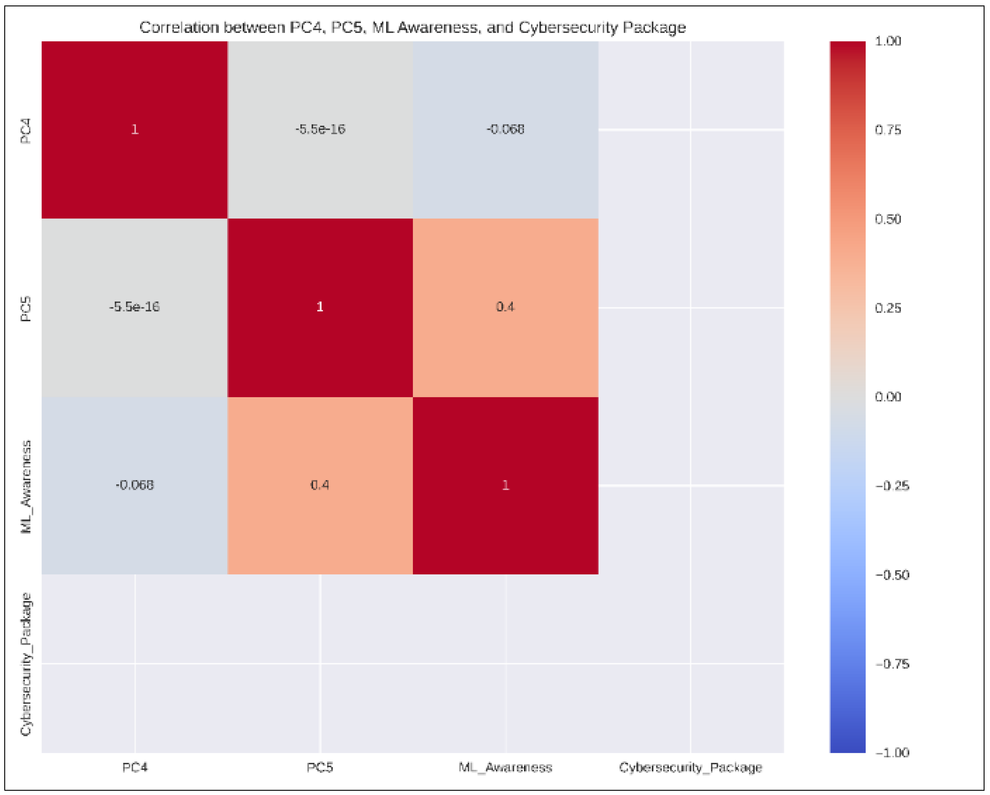 In order to synthesize the investigation of educational background and adoption rates, the inquiry regarding the implications of educational background and professional development (captured by PC4 and PC5) on the adoption of ML and cybersecurity in SMEs is a valuable one. To explore this relationship further, there is a need to analyze the correlation between these components (PC4 and PC5) and relevant variables in the dataset, such as those measuring ML awareness and cybersecurity practices. However, this encountered a data pre-processing challenge. Some text data, likely from columns like “ML_Awareness” and “Cybersecurity_Package,” needed conversion into numerical values for compatibility with PCA. Therefore, the need to address this issue by transforming these categorical variables (e.g., “High Awareness” or “Basic Package”) into numerical representations before proceeding with the correlation matrix calculation proved vital. The correlation matrix ultimately helped elucidate the relationships between these components and other variables within the dataset as shown in Figure 7.