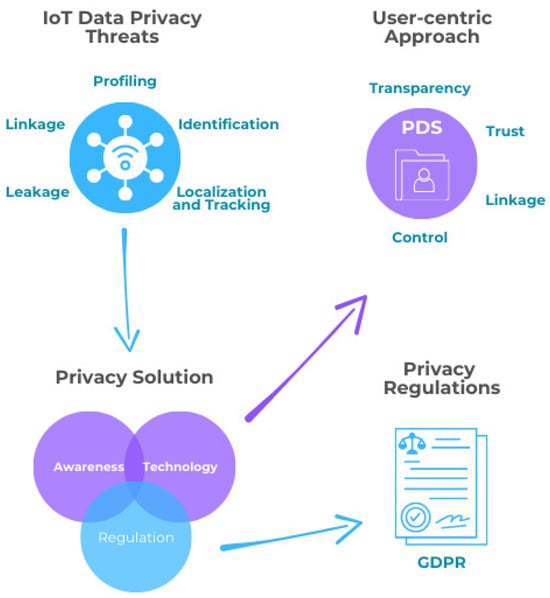 Figure 1 summarizes the structure and logical flow of this study, starting from the identification of privacy threats in the IoT context, moving through privacy protection via the ART approach (Awareness, Regulation, and Technology) and culminating in the exploration of PDSs as a user-centric privacy solution. Hence, in this paper, we discuss the main characteristics of data privacy challenges in the IoT context and explore the role of PDS-based solutions in enhancing user privacy. This way, it makes significant contributions in the following ways: