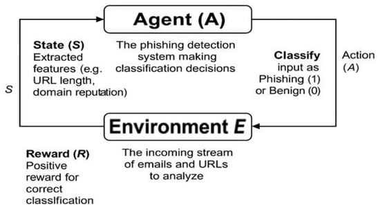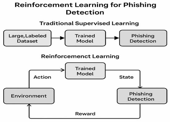 RL offers a dynamic, adaptive, and self-improving approach to phishing detection. Unlike traditional supervised ML models that rely on large, labeled datasets and static training, RL systems learn from interaction with their environment, making them highly effective in combating evolving phishing tactics []. This continuous learning capability aligns perfectly with the dynamic nature of cybersecurity threats, where new attack vectors emerge regularly as shown in Figure 2 below.