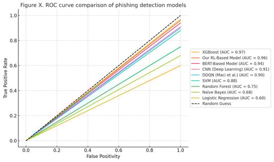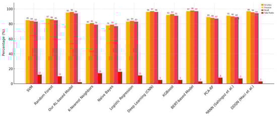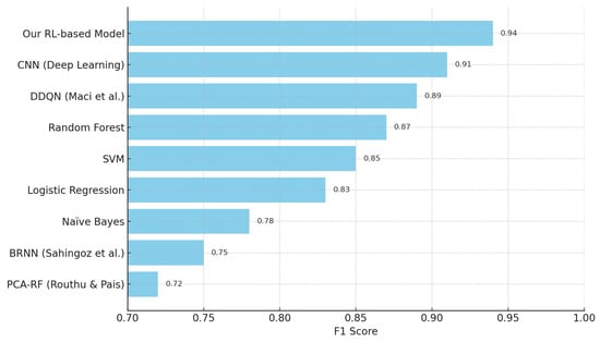 In Figure 5 below provides a comparative bar chart illustrating the F1 scores of various phishing detection models. Our RL-based model leads with the highest F1 score (0.94), followed by CNN (0.91), DDQN [] (0.89), and Random Forest (0.87). Classical models like Naïve Bayes and PCA-RF [] show lower F1 scores of 0.78 and 0.72, respectively, highlighting their limited effectiveness in handling complex phishing patterns. These results demonstrate the superior classification balance achieved by reinforcement learning and deep learning models.