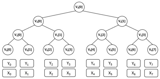 In Figure 1, firstly, the signer generates a set of 2 h OTS key pairs, X j , Y j , where h is the height of the Merkle tree. The first one, X j , is the signature key or secret key, the other is the verification key or public key. Each one-time signature key pair consists of a secret key and a corresponding public key X i , Y i   for   i = 0,1 , , 2 h 1 .