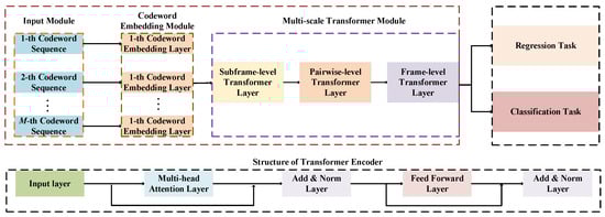 This section presents the Multi-Scale Transformer with Multi-Task Learning (MT-MTL) framework, designed for the steganalysis of speech streams without prior knowledge of embedding rates. The model leverages the hierarchical structure of speech signals and simultaneously addresses two interrelated objectives: classifying multiple embedding rates and estimating embedding intensity. The framework comprises four key components: an input processing module, a codeword-embedding module, a multi-scale transformer module, and a multi-task learning mechanism. The overall system architecture is illustrated in Figure 1.