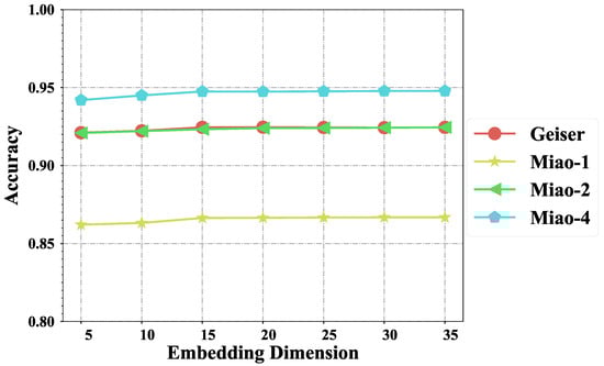 As illustrated in Figure 2, increasing the embedding dimension generally leads to improved classification accuracy across all evaluated datasets; however, the performance gains tend to plateau beyond a dimension of 20. Specifically, for the Geiser dataset [], the peak accuracy of 92.46% is observed at dimension 20. For the Miao () dataset, the highest accuracy (86.68%) is achieved at dimension 35. In the case of Miao () [], accuracy continues to increase with larger dimensions, reaching 92.45% at 35. The Miao () dataset [] demonstrates the most significant benefit from higher dimensions, achieving 94.79% at 35. Nonetheless, the limited performance improvement beyond dimension 20 indicates that, for less complex datasets, lower-dimensional embeddings can achieve comparable detection performance with reduced computational cost, suggesting that a dimension of 20 offers a practical trade-off.