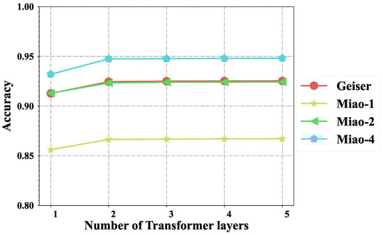 As shown in Figure 3, increasing the number of transformer layers generally leads to improved classification accuracy across all datasets, although the performance gains diminish beyond a certain depth. On the Geiser dataset [], accuracy reaches a maximum of 92.53% with five layers, with the most significant improvement observed between one and two layers. For the Miao () dataset [], performance peaks at 86.71% with five layers, stabilizing after three layers. Similarly, the Miao () dataset [] achieves 92.42% accuracy, with marginal improvements beyond three layers. In contrast, the Miao () dataset [], characterized by higher embedding complexity, benefits more from deeper architectures, achieving 94.81% accuracy with five layers. These findings suggest that, while increased transformer depth can enhance detection performance, simpler datasets can achieve near-optimal accuracy with two to three layers, whereas more complex cases necessitate deeper models for effective feature extraction.