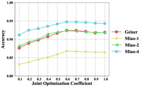 As shown in Figure 4, the relationship between and classification accuracy exhibits a non-linear trend. Accuracy improves significantly as increases from 0.1 to 0.6, highlighting the benefits of incorporating regression for improved generalization and feature learning. The Geiser dataset [] achieves its highest accuracy of 92.454% at , while the Miao () dataset [] reaches 86.64% under the same configuration. Similarly, the Miao () and Miao () datasets [] attain peak accuracies of 92.33% and 94.75%, respectively, at . However, further increasing leads to a slight degradation in performance, suggesting that excessive emphasis on regression may undermine the classification objective. These findings emphasize the importance of balancing both tasks, with identified as the optimal setting for maximizing detection performance.