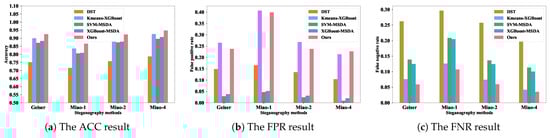 Figure 5 presents the performance comparison of various methods. The DST-based approach [] exhibited the lowest accuracy, around 75% on the Geiser dataset and below 80% on others. SVM-MSDA [] and XGBoost-MSDA [] demonstrated moderate improvements, with SVM achieving 87.1% on Geiser and XGBoost slightly surpassing it at 88.3%. The Kmeans-XGBoost [] method outperformed these baselines, reaching nearly 90% on Geiser and maintaining stable performance across datasets. Our proposed method achieved the highest detection accuracy, reaching 92.45% on Geiser and 94.75% on Miao (), consistently surpassing all baselines. While Kmeans-XGBoost [] attained a 5% FNR on Geiser, our approach further reduced it to 3.5% on Miao (), demonstrating superior detection capability, especially at low embedding rates. Additionally, our method maintained competitive FPR values, effectively minimizing false positives across all datasets.