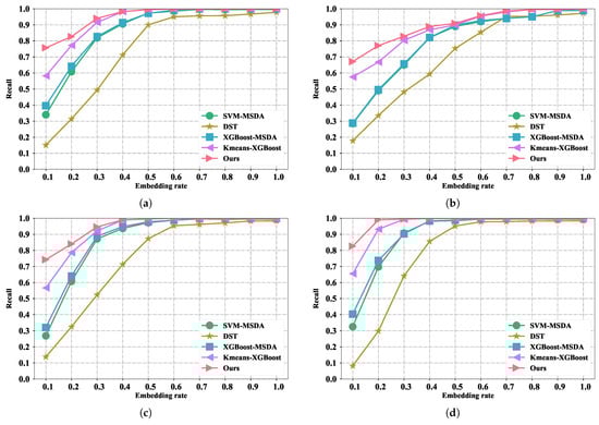 The recall result with each embedding rate on multiple steganography methods. (a) The recall result with each embedding rate on Geiser’s steganography method; (b) the recall result with each embedding rate on Miao’s ( = 1) steganography method; (c) the recall result with each embedding rate on Miao’s ( = 2) steganography method; (d) the recall result with each embedding rate on Miao’s ( = 4) steganography method.