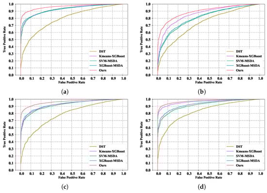 The ROC results of multiple steganography methods. (a) The ROC result on Geiser’s steganography method; (b) the ROC result on Miao’s ( = 1) steganography method; (c) the ROC result on Miao’s ( = 2) steganography method; (d) the ROC result on Miao’s ( = 4) steganography method.