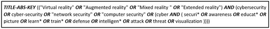 - Search Terms: Our search string included all the terms that are relevant to the research objectives (i.e., RQs) of this survey. Figure 1 shows the developed search string that is mainly composed of two parts: (i) the first part consisted of different “immersive technologies”, and (ii) the second part contained the synonyms and relevant terms of “cybersecurity” and “cyber situational awareness”. It is important to note that the terms were searched in the title, keywords, and abstract of the papers available at Scopus to identify and extract the relevant literature on ICSA systems.