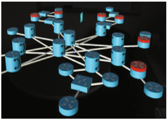 Node-Link Graphs: Large-scaled network topologies are presented by node-link graphs to identify and understand how nodes (e.g., entities) are connected with each other. This provides an overview of network topologies, where nodes and their links are drawn as points and lines, respectively. For instance, the 3D Cyber COP prototype, developed by Kabil et al. [32], presents a holistic view of network topologies through node-link graphs for cybersecurity coordinators, which provides them with an understanding of network security state. Similarly, the 3D Network Visualizer application [29] contracts node-link graphs for showing network assets and their relationships with each other. Figure 4 shows the node-link graphs developed by the 3D Network Visualizer application for cyber situational awareness.