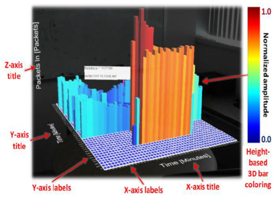 Three-Dimensional Bar Charts: Three-dimensional bar charts refer to the representation of information with rectangular bars of different widths, heights, and colors presenting the corresponding cybersecurity data in an immersive three-dimensional space. These charts are mostly used to perform a comparative analysis of multidimensional data in the cybersecurity realm. For instance, Beitzel et al. [37] developed a prototype application, called MINER, to perform a network anomaly analysis with 3D bar charts (Figure 6). The unique design of these 3D bar charts allows for a more intuitive and time-efficient identification of irregularities within network data. By presenting the information in this visually accessible manner, MINER enhances the cyber situational awareness of its end-users.