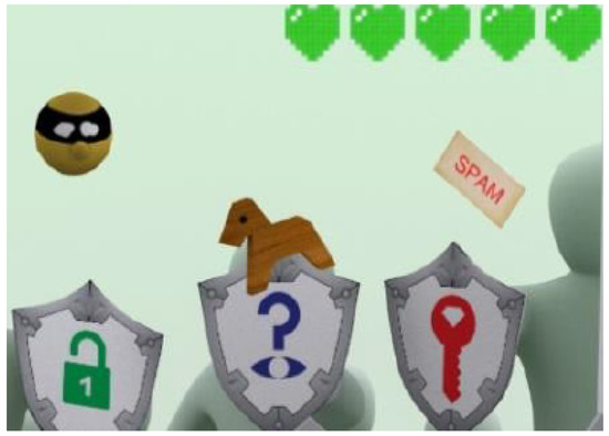 - Salazar, M.; Gaviria, J.; Laorden, C.; Bringas, P.G. Enhancing cybersecurity learning through an augmented reality-based serious game. In Proceedings of the 2013 IEEE Global Engineering Education Conference (EDUCON), Berlin, Germany, 13–15 March 2013; pp. 602–607. [Google Scholar]