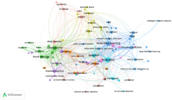 A systematic search strategy was meticulously developed using a precise combination of keywords to accurately capture the relevant literature on the integration of FL and ML/DL in cybersecurity. The primary search terms incorporated both general and specific terminology prevalent in the field, including (“Federated Learning” OR FL) AND (“Machine Learning” OR ML OR “Deep Learning” OR “DL”) AND (“Cybersecurity” OR “Threat Detection” OR “Intrusion Detection” OR “Malware Detection” OR “Fraud Detection” OR “Network Security” OR “Anomaly Detection”), along with specific terms such as “Federated Machine Learning” (FML) or FML, “Federated Deep Learning” (FDL) or FDL, “Horizontal Federated Learning” (HFL) or HFL, and “Vertical Federated Learning” (VFL) or VFL. Boolean operators (AND, OR) were consistently utilized to refine these queries, ensuring the identification of studies that specifically addressed the combination of federated learning with machine learning or deep learning for various cybersecurity mechanisms. Figure 1, generated using VOSviewer version 1.6.20 [18], visually represents the co-occurrence of key research terms in the initial pool of identified papers, illustrating the interconnectedness of these areas and guiding the refinement of our search strategy. This structured approach facilitated the identification of research studies exploring key dimensions such as accuracy, privacy preservation, scalability, explainability, and robustness in cybersecurity frameworks [18,19,20].