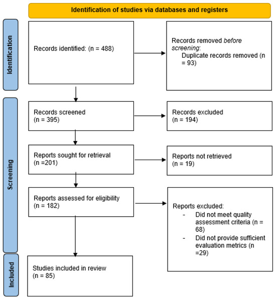 The study selection process strictly adhered to the Preferred Reporting Items for Systematic Reviews and Meta-Analyses (PRISMA) guidelines, ensuring transparency, methodological rigor, and replicability throughout the review process. This process was divided into four distinct stages: Identification, Screening, Eligibility, and Inclusion. In the identification phase, the initial search using the refined keyword combinations across the targeted databases, resulted in the identification of 488 articles. Following automated and manual duplicate removal, a total of 395 unique records progressed to the screening phase. The screening phase involved a rigorous review of titles and abstracts to evaluate their alignment with the study’s objectives and the refined inclusion/exclusion criteria. Articles that did not explicitly address the combination of federated learning and machine learning/deep learning for cybersecurity applications were excluded, leading to the removal of 194 articles that lacked direct relevance or methodological focus. During the eligibility phase, the remaining 201 full-text articles were assessed for conformity with the predefined inclusion and exclusion criteria. Studies that failed to meet quality standards or did not provide sufficient evaluation metrics relevant to our five dimensions (accuracy, privacy, scalability, explainability, robustness) were excluded. A total of 97 articles were excluded during this phase for various reasons, including failure to meet quality assessment criteria 68 studies) and insufficient evaluation metrics (29 studies). Additionally, 19 articles could not be retrieved despite repeated attempts. Finally, in the inclusion phase, 85 studies were included in the systematic review for detailed analysis. These studies demonstrated strong methodological foundations and clear relevance to the application of FL+ML/DL in cybersecurity, particularly in enhancing intrusion detection systems (IDS), malware detection, anomaly detection, and network threat analysis. The entire study selection process is visually represented in the updated PRISMA flow diagram (see Figure 2), which outlines each step from identification to final inclusion, providing transparency and replicability in the selection methodology.