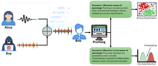 Scenario 1: Awareness of Jammed Signals. In the first scenario, we consider the case where both jammed and non-jammed data samples are available, enabling a supervised learning approach. The detection system utilizes labeled training data from both classes—“jammed signal” and “non-jammed signal” (see Section 5)—to develop a robust binary classification model for jamming detection. While this approach effectively identifies known attack patterns, it faces several significant challenges. First, collecting and maintaining representative jamming samples requires substantial effort, particularly as ’s jamming techniques evolve over time. Second, the system must accurately differentiate between intentional jamming attacks and the noise due to the communication link. Finally, maintaining a balanced dataset between clear and jammed samples is crucial for maximizing the classification performance.