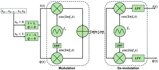 Binary Phase-Shift Keying (BPSK) is the simplest and most noise-robust phase modulation technique, and it is largely used in PLC networks [43,44]. According to this technique, the phase is shifted (modulated) at and to transmit bits with values 0 and 1, respectively. Figure 2 shows a schematic representation of BPSK, highlighting the main components. BPSK modulates two symbols by changing the phase of the reference carrier; i.e., when , the phase becomes and when bit is being transmitted, as defined by Equation (2).
