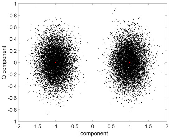 BPSK modulation. The receiver assumes the positions of the symbols at red crosses under ideal conditions [I = −1, ] and [, ], but signals are displaced from their actual positions due to noise and manufacturing imperfections.