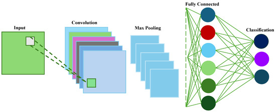 CNNs consist of neurons that refine their performance through the learning process. Each neuron receives an input and executes operations, such as a scalar product, followed by a nonlinear function. Typically, a CNN architecture is defined as a sequence of convolutional layers, pooling layers, and fully connected layers primarily dedicated to pattern recognition in images. A typical representation of a CNN is provided in Figure 4, where the input layer serves as the model’s input, and the output layer provides class predictions.