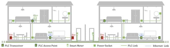 As previously described regarding the two scenarios in Section 3, this section develops the theoretical framework for our reference scenario model. We consider a standard BB-PLC network deployed in a residential environment, as illustrated in Figure 5.
